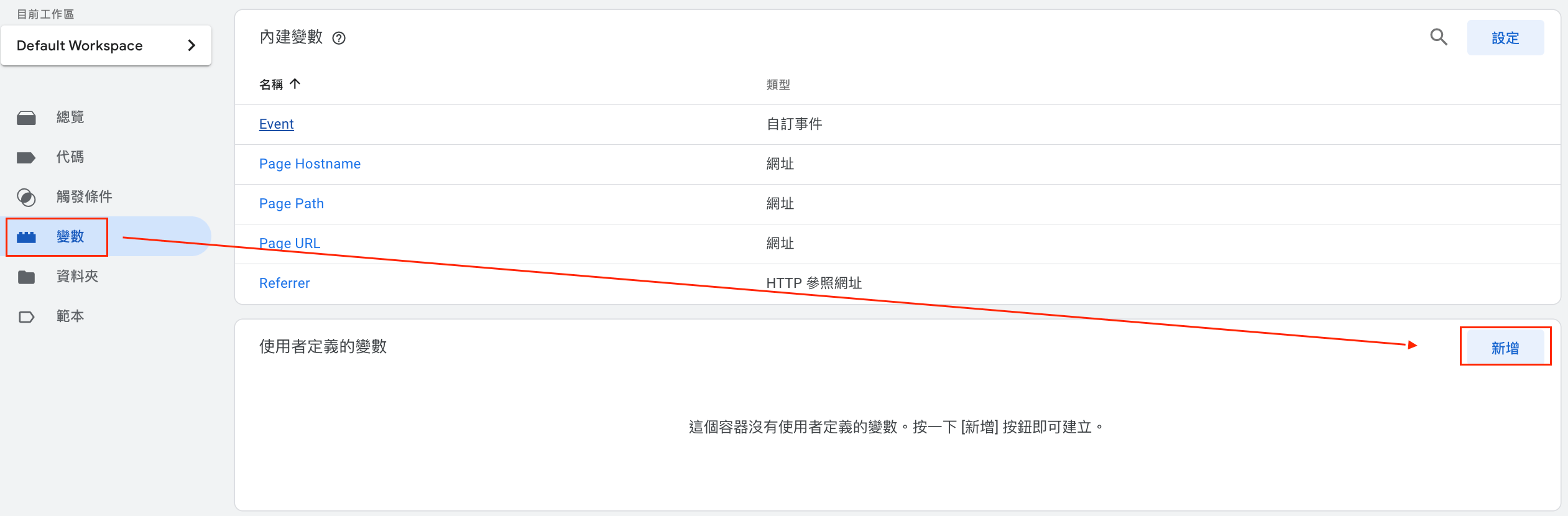 GTM 左側面板選擇「變數」 > 下方「使用者定義的變數」區塊右上角「新增」 > 選擇「自訂 Javascript 」變數